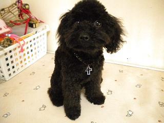 プードルの男の子です。当店から養子に行った子です。はじめてのトリミングはちょっぴり怖かったのかな? (10/03/03 12:26)