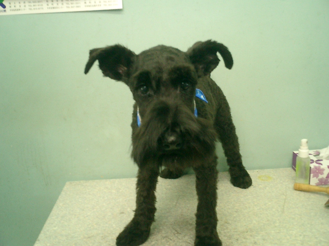 シュナウザーの男の子です。珍しいブラックのシュナウザーです。サマーカットで涼しそうでしょ。まだ、5ヶ月の子供ですがとても聞き分けの良い子です。 (07/06/01 11:43)