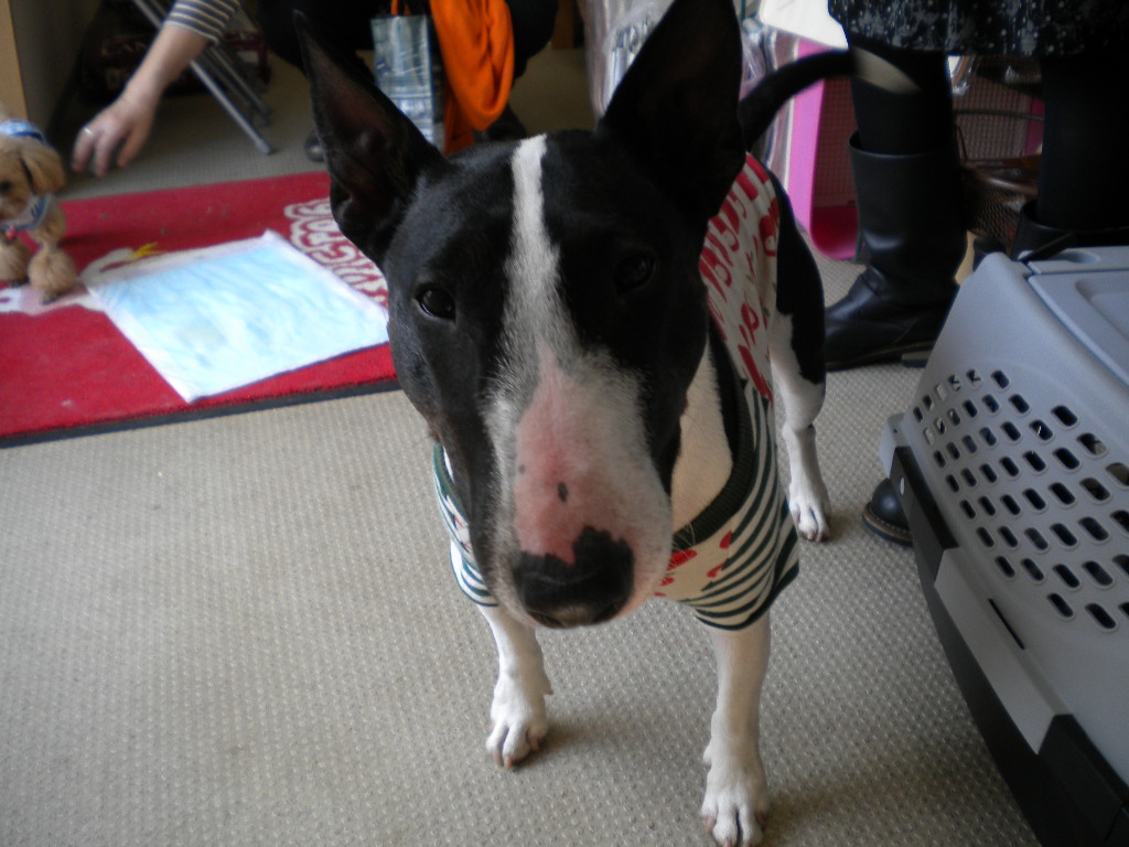 ブルテリアの男の子です。うちのヒメとコナンの子供です。大阪から遊びに来てくれました。とっても大人しくておりこうさんです。ブルテリアとは思えない。うちのやんちゃ坊主も弥七くんを見習ってね。 (14/05/03 15:07)