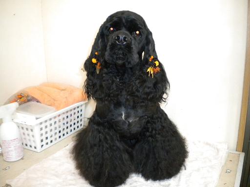 プードルの男の子です。当店から養子に行った子です。はじめてのトリミングはちょっぴり怖かったのかな? (10/03/03 12:26)